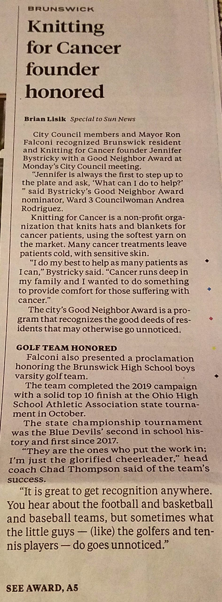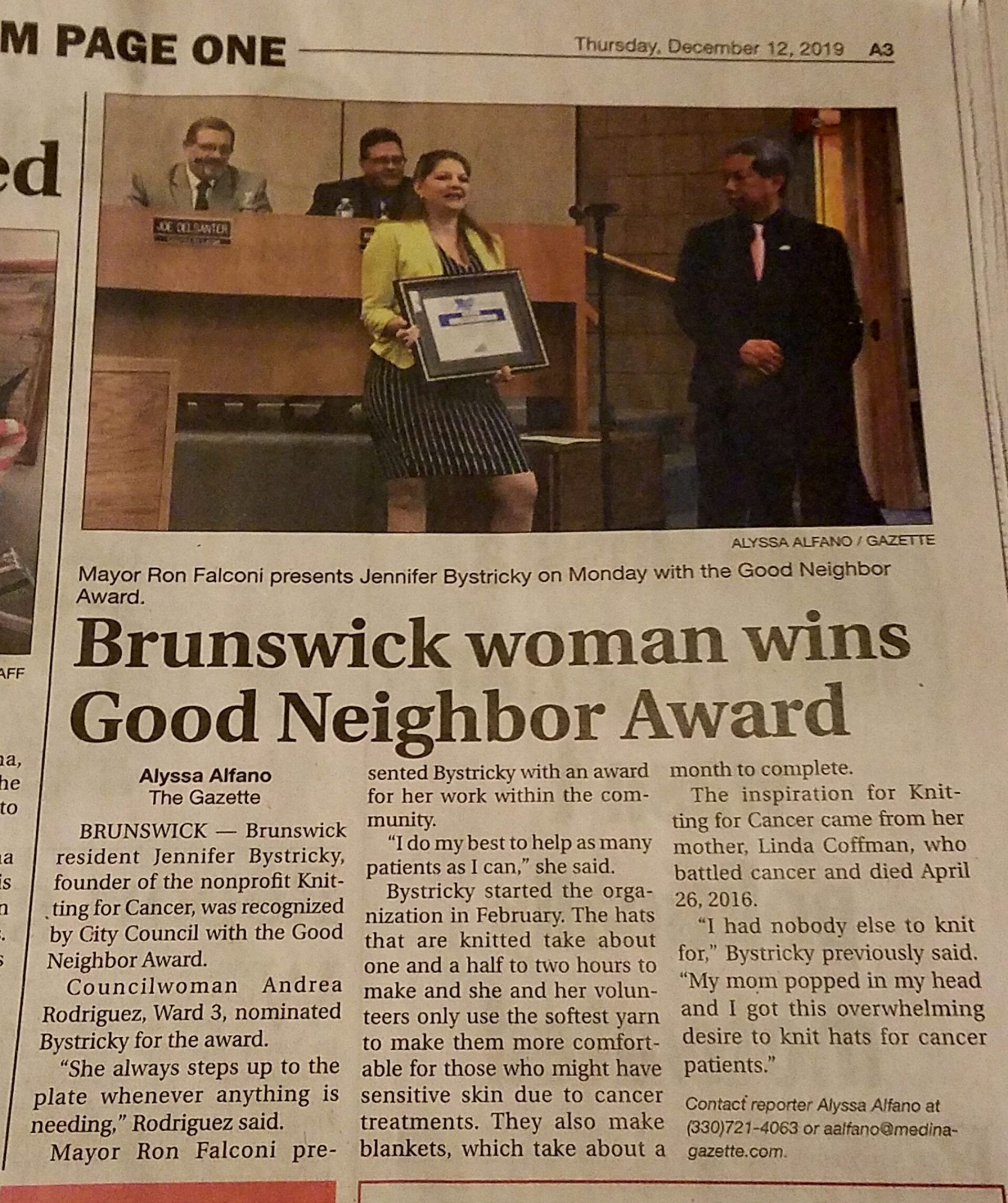 After her mom passed, she found herself with no one to knit for. To ease her fibromyalgia, she began knitting hats thinking her church would get them to the proper donation sites. The church suggested starting a ministry, but the ministry requires splitting donations with the church. Thus, was the birth of Knitting for Cancer Inc, where 100% of donations are spent benefiting cancer warriors. On February 28, 2019 she started the paperwork, and on March 15, 2019 it was approved as 501(c)(3).