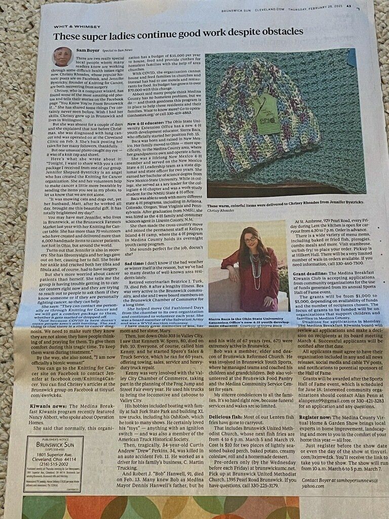 Knitting for Cancer is all about making warriors warm and comfortable. It’s about bringing comfort during a trying time. Warriors love receiving a hand-made gift and knowing that someone cares. Knitting for Cancer Inc. is experiencing its growth due to the tremendous dedication from Knitting for Cancer Team and Volunteers. Teaching knitting classes has led to the expansion of four classes including teaching inmates at Grafton Correctional Institute and growing.